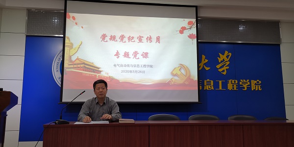 党风党纪宣传专题党课在26楼E区多功能报告厅举办。本次活动为学院党风党纪宣传月系列活动之一,旨在深入学习贯彻习近平新时代中国特色社会主义思想和党中央关于全面从严治党的系列决策部署要求,提高党员对于党章党规的理解,督促党员增强“四个意识”、坚定“四个自信”、做到“两个维护”。专题党课由党委书记李继平为党员讲授。李继平书记强调了党规党纪学习的重要性,从开展学习的时代背景和党的事业发展的必然需求两方面阐述了学习党规党纪的重要意义。