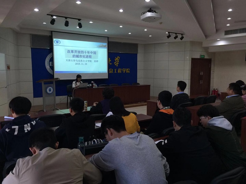 马克思主义学院屈婷老师为大家做《改革开放四十年中国的城市化进程》专题报告,学院近百位师生参加了报告会。
