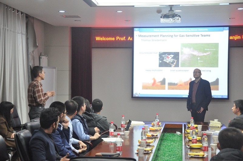 进行学术交流,简要介绍了机器人与自主系统研究所的基本情况、研究方向及科研成果。随后,Lilienthal教授在研讨会上作了长达2小时的精彩主题报告。Lilienthal教授首先从“研究机器人嗅觉的意义”、“移动机器人嗅觉的研究现状”,“移动机器人嗅觉的研究挑战”三方面全方位介绍了移动机器人嗅觉,接着重点介绍了其团队在机器人嗅觉方面的研究工作和取得的代表性成果。