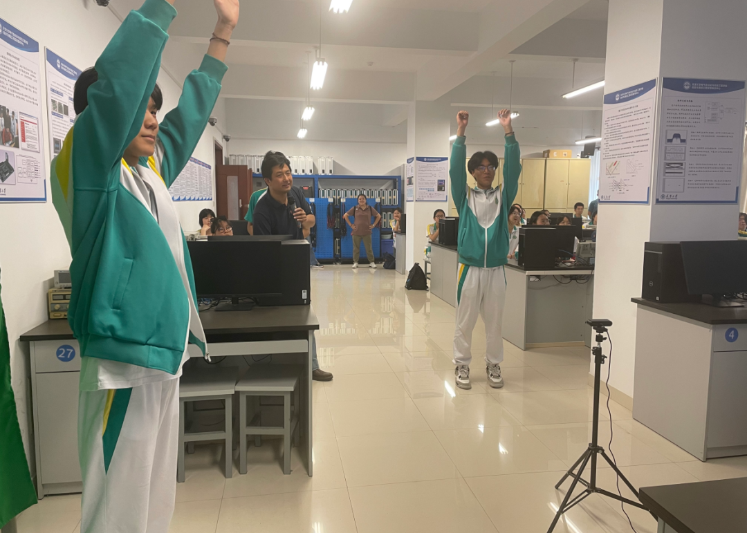 在信息与通信技术科普教育基地,学院教师李根为同学们展示了智慧校园物联网平台、人工智能计算机视觉目标检测技术等科技成果,并组织同学们参与了虚拟猜拳、虚拟试衣、隔空取物、虚拟人舞蹈等人机互动项目,引导同学们充分感受信息与通信技术的魅力,激发同学们探索未知的欲望。