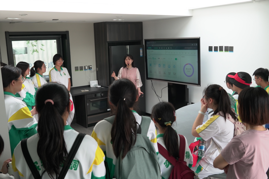在智慧能源科普教育基地,学院教师宋关羽与王智颖为同学们介绍了光伏供电系统、讲解了非侵入式负荷监测技术、展示了基于地源热泵的室内温度管理机制。同学们对清洁能源的应用、直流电源设备等兴趣盎然,踊跃提问。